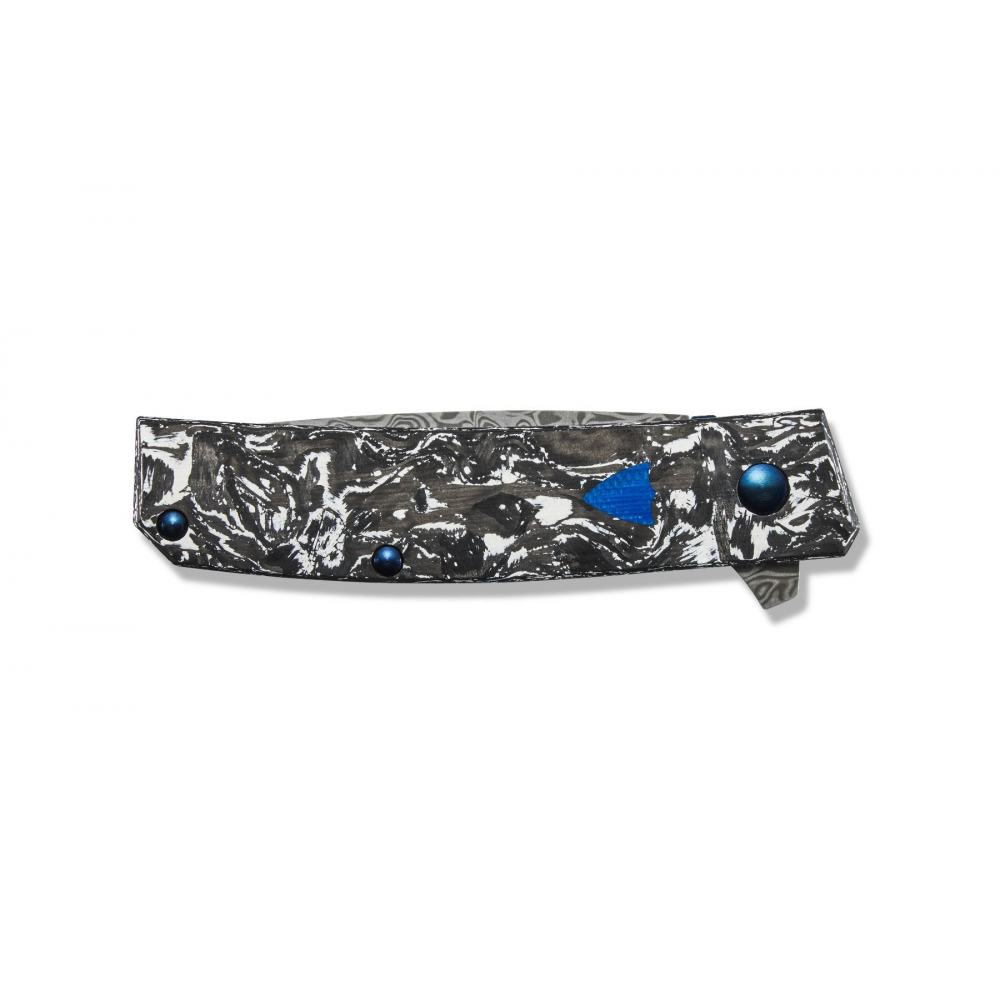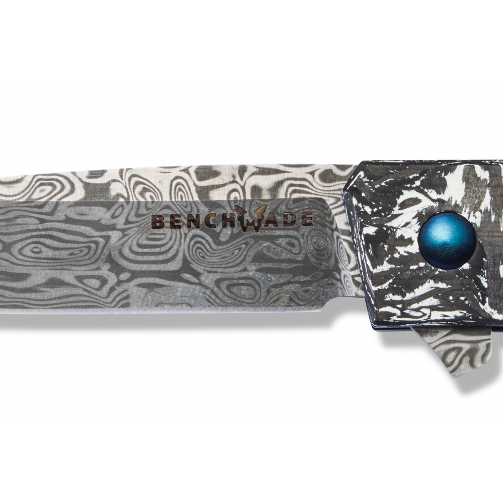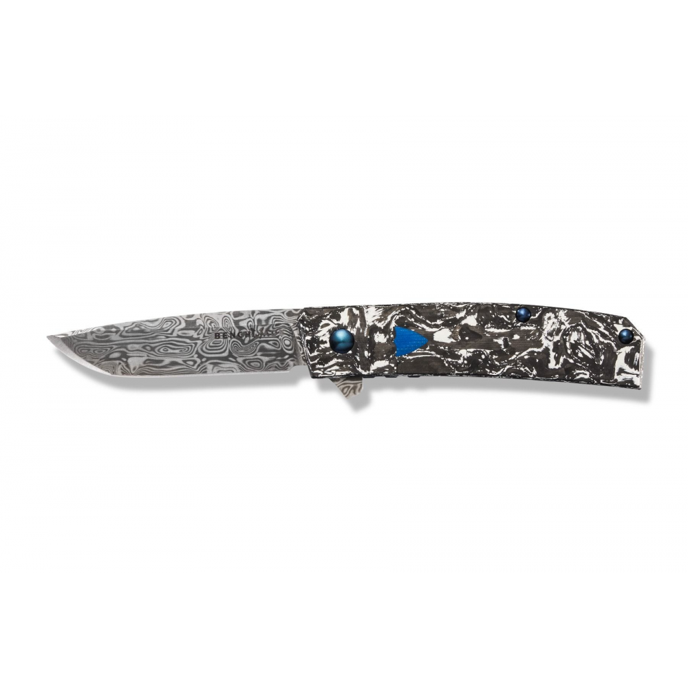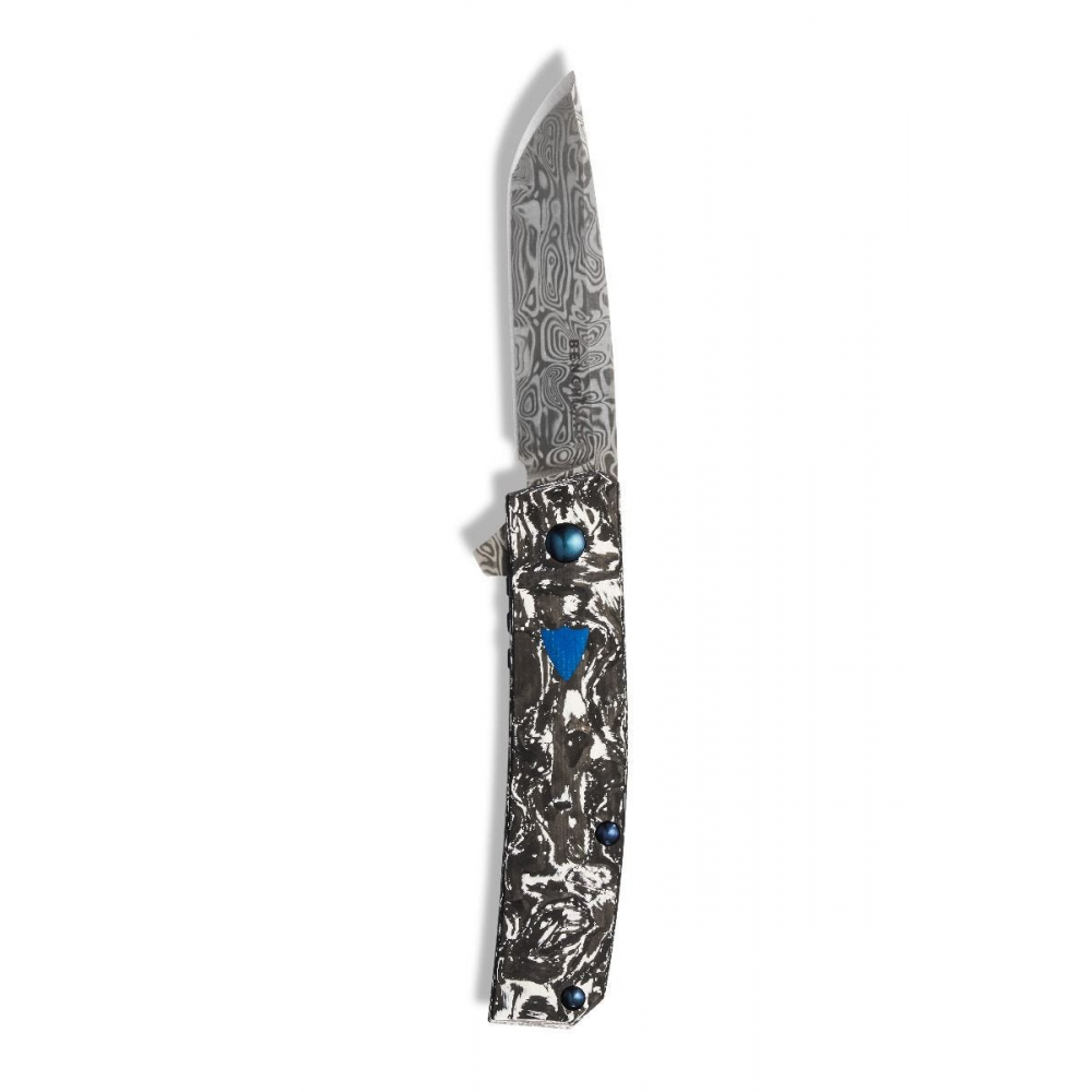 O Canivete Benchmade Oeser Tengu Flipper 601-211 Aço Damasco inclui bainha de couro.