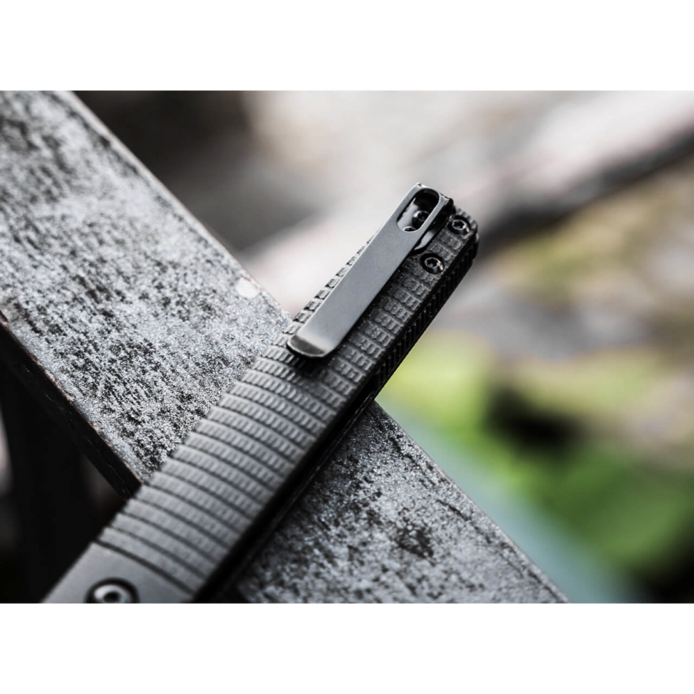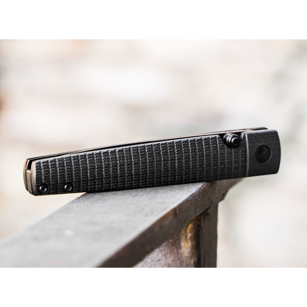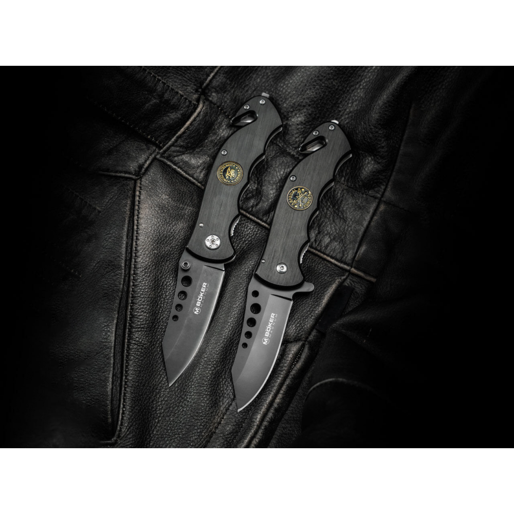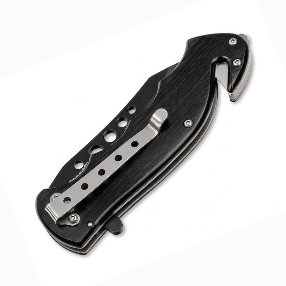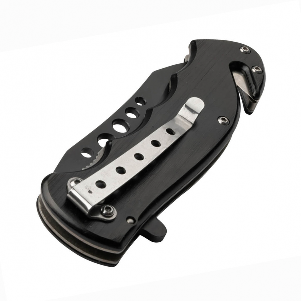 O cabo de alumínio revestido de preto carrega um emblema com o brasão das forças especiais. A lâmina de aço inoxidável 440A é travada por um mecanismo linerlock. Os orifícios no cabo conferem um toque muito atraente à peça e reduzem o peso total. Ele possui ainda clipe de bolso, quebra-vidros e corta-cintos, características que fazem desse canivete uma peça perfeita para seu equipamento de emergência.