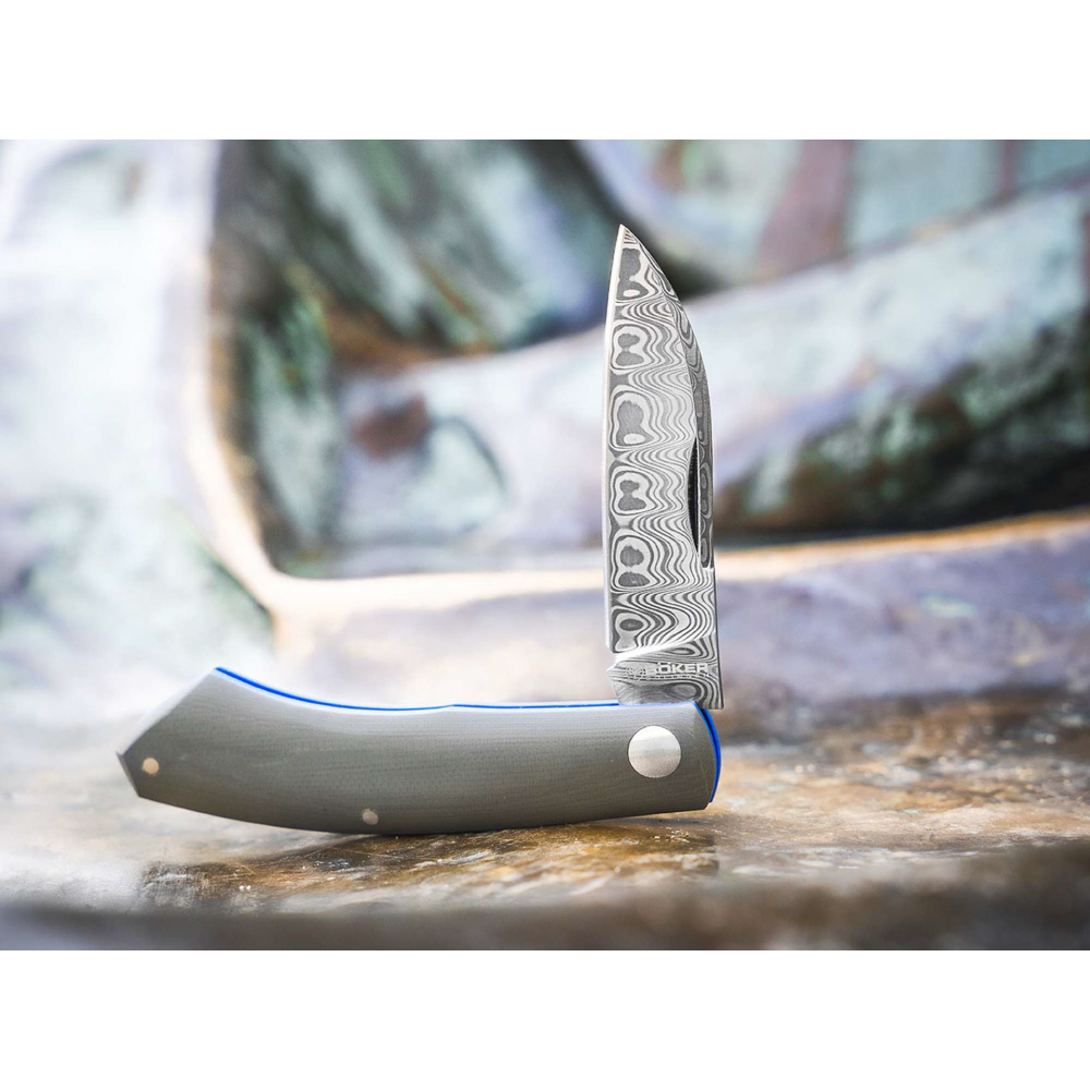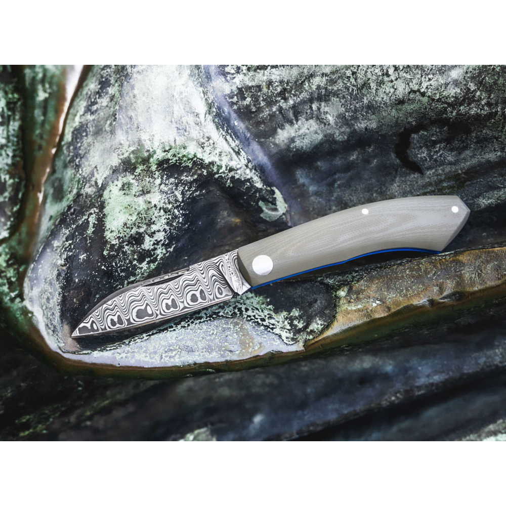 Para a interpretação moderna de uma forma tradicional de canivete, o aço damasco de metalúrgia em pó da empresa sueca Damasteel pareceu um material de lâmina apropriado. A produção do Damasteel requer - mesmo que os meios técnicos mais modernos sejam utilizados - tanta habilidade e experiência quanto a forja manual de aço. A pureza e as propriedades do aço Damasteel podem ser otimizadas ao extremo com processos combinados complexos. A construção autoportante de laminado G10 azul e cinza contrasta lindamente com o padrão escolhido "Odins Eye" do aço Damasteel da lâmina. O simples, mas sempre funcional, slipjoint é uma parte obrigatória deste tipo de canivete. O tamanho, peso, as talas de G10 indestrutíveis e o aço Damasteel inoxidável tornam esta faca de colecionador excelente ao mesmo tempo para EDC. Entregue em um display suspenso com certificado de autenticidade e número de série. Estritamente limitado a 999 cópias em todo o mundo.