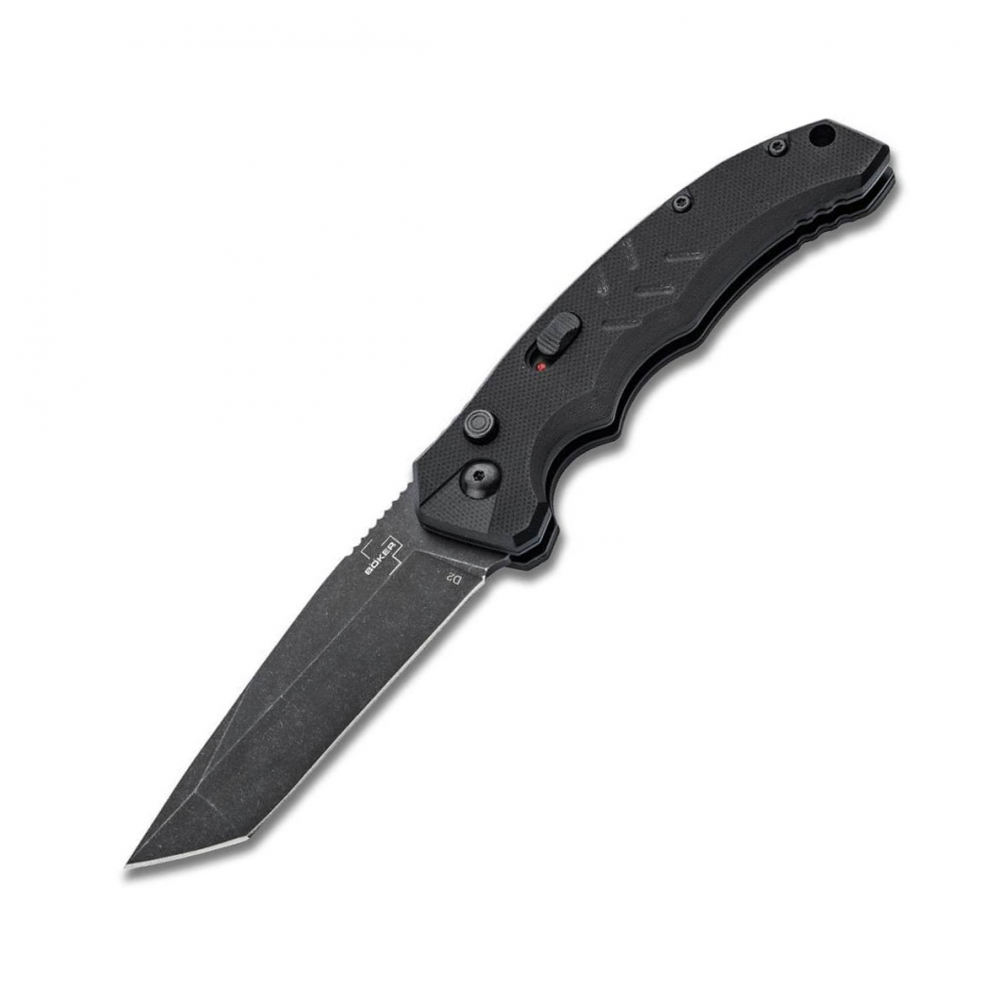 O Böker Plus Intention foi projetado como um canivete tático - mas ele também é capaz de lidar com as tarefas do dia-a-dia sem problemas. Possui lâmina em aço D2, que é acionada com o aperto de um botão. Uma trava de segurança garante que o canivete não seja aberto acidentalmente. O cabo ergonômico é feito em G10 preto texturizado, com detalhes serrilhados e entalhes que melhoram ainda mais seu grip. O apelo tático é realçado pelo acabamento stonewashed preto da lâmina. Também apresenta orifício para fiel e clipe (tip-down/destro).