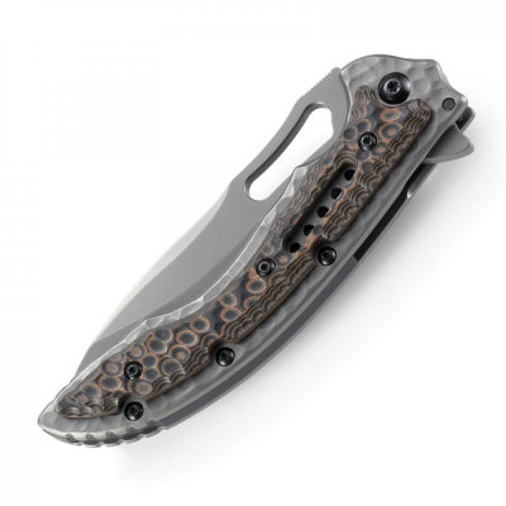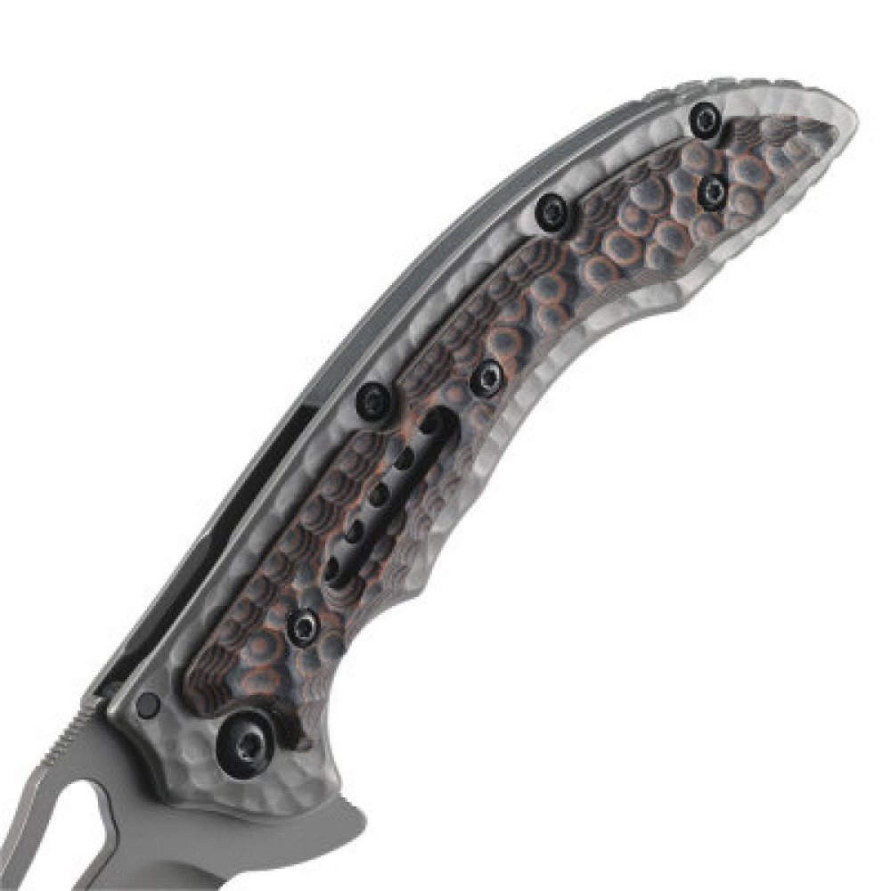 Canivete CRKT Fossil Compact serrilhado, desenhado. Tamanho total: 19,5 cm. Tamanho da lâmina: 8,7 cm. Material da lâmina: Aço inox 8Cr13MoV. Dureza: 58-60.