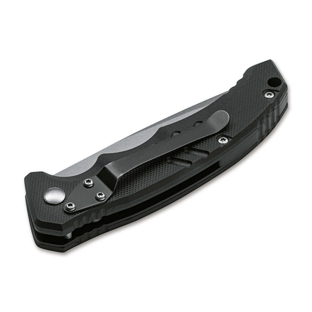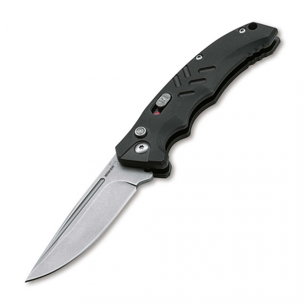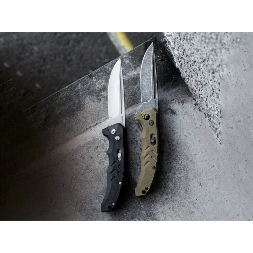 Pressionando o botão, a lâmina feita de aço ferramenta D2 com acabamento stonewash é aberta automaticamente pela liberação da tensão de uma mola atrás dela. Uma trava deslizante adicional protege ainda mais o canivete contra aberturas acidentais. O cabo ergonômico é feito de G10 texturizado, as ranhuras na área do apoio para o polegar e os recessos pronunciados para os dedos melhoram ainda mais a pegada.
