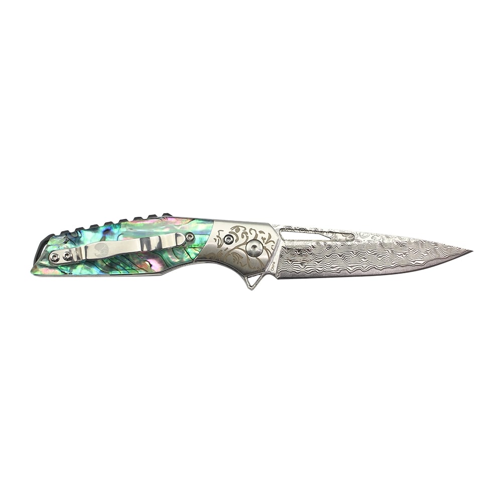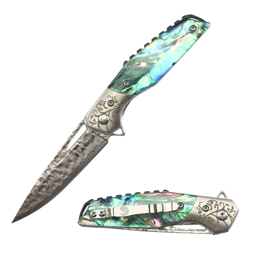 Canivete Elk Ridge dobrável manual, elegante e funcional, com lâmina em aço damasco e cabo em concha de abalone.