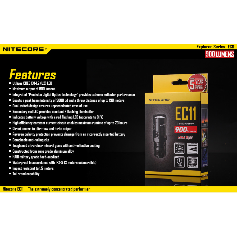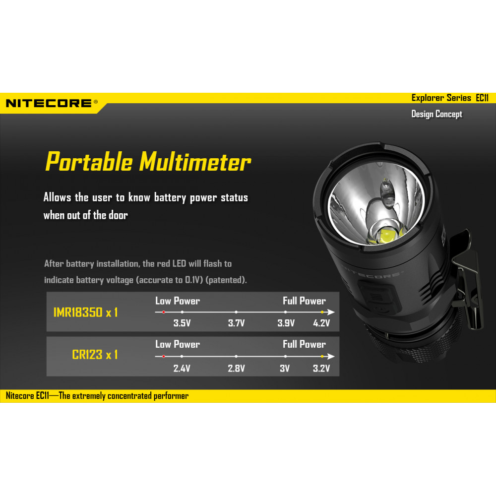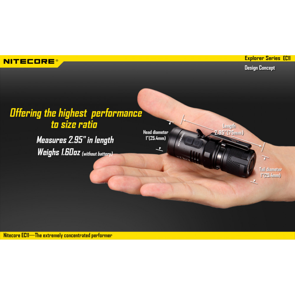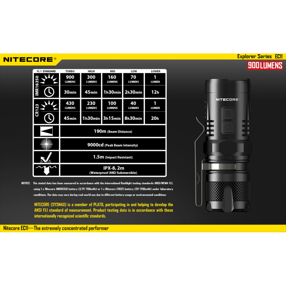 Medidas obtidas em laboratório utilizando bateria Nitecore IMR18350 3.7V 700mAh ou bateria Nitecore CR123A 3V 1700mAh.