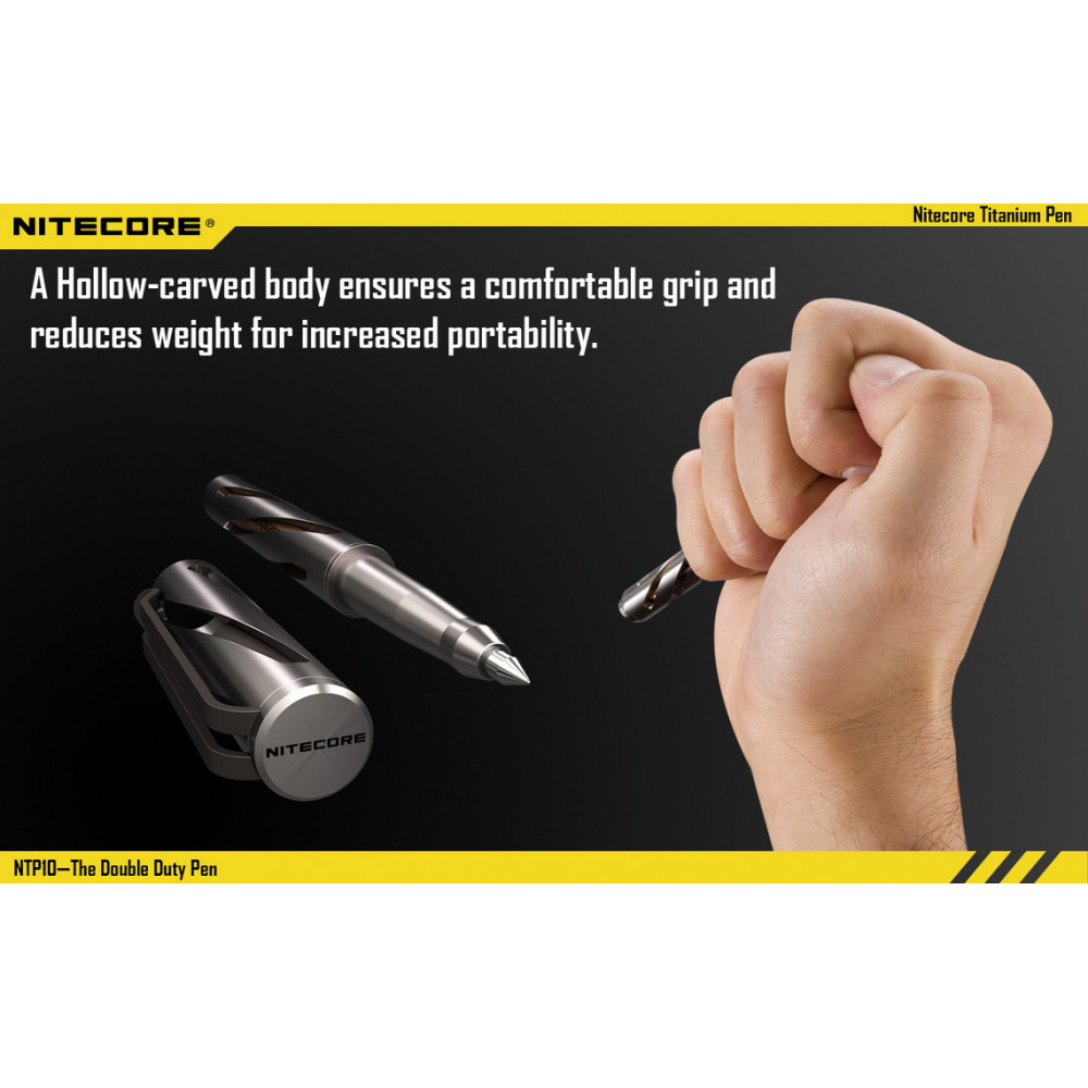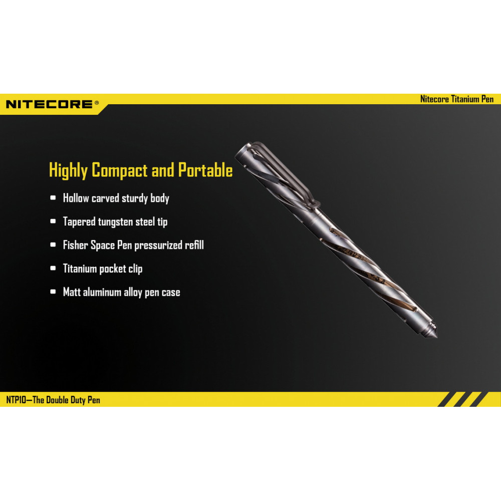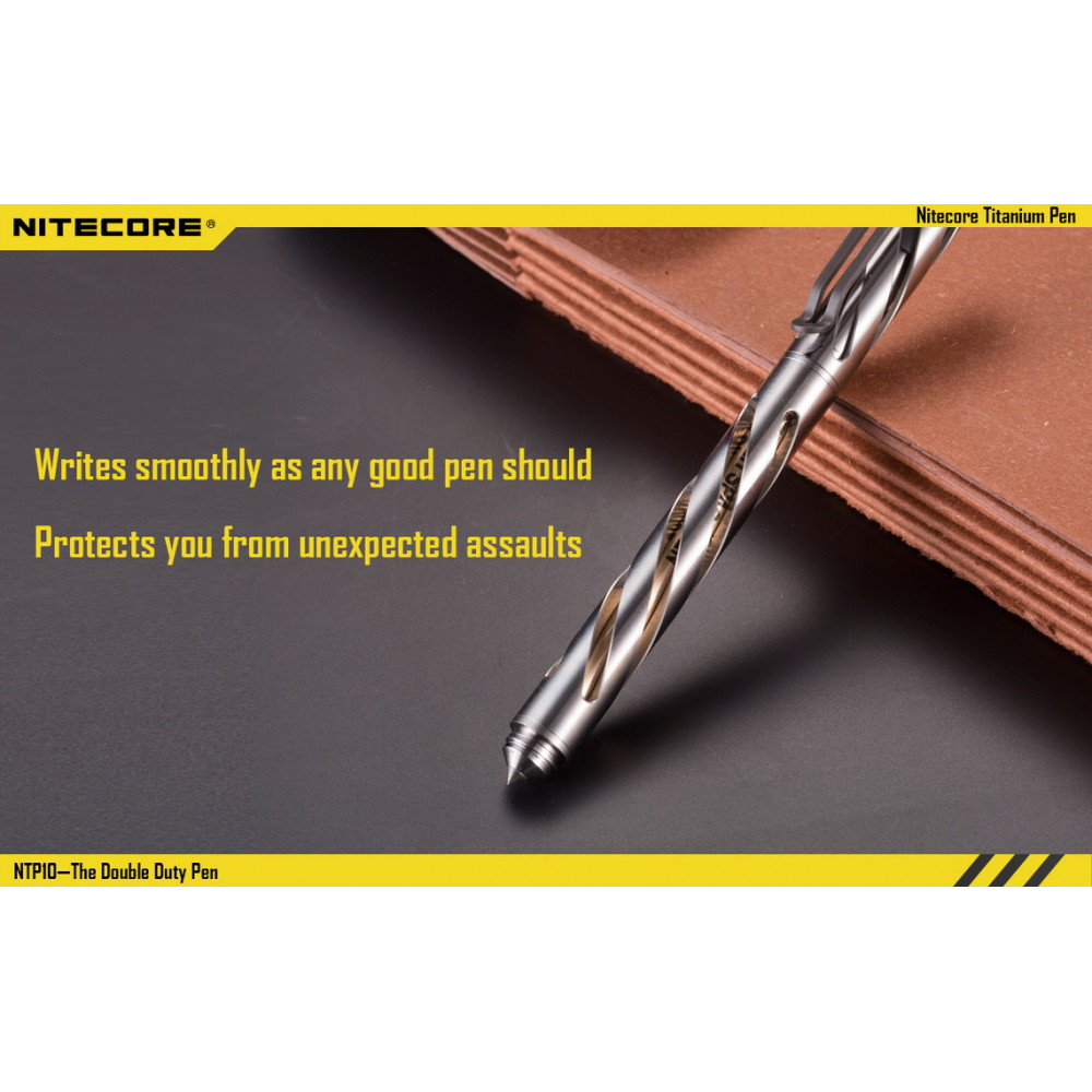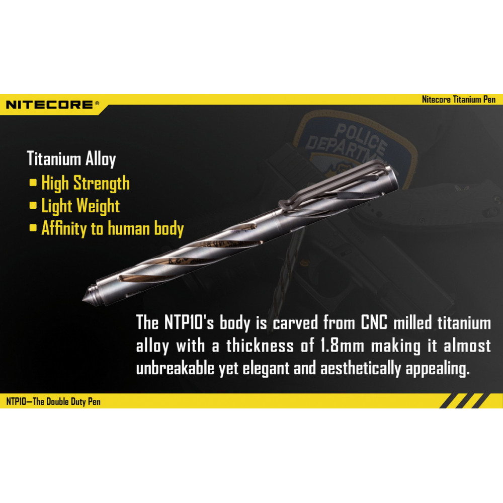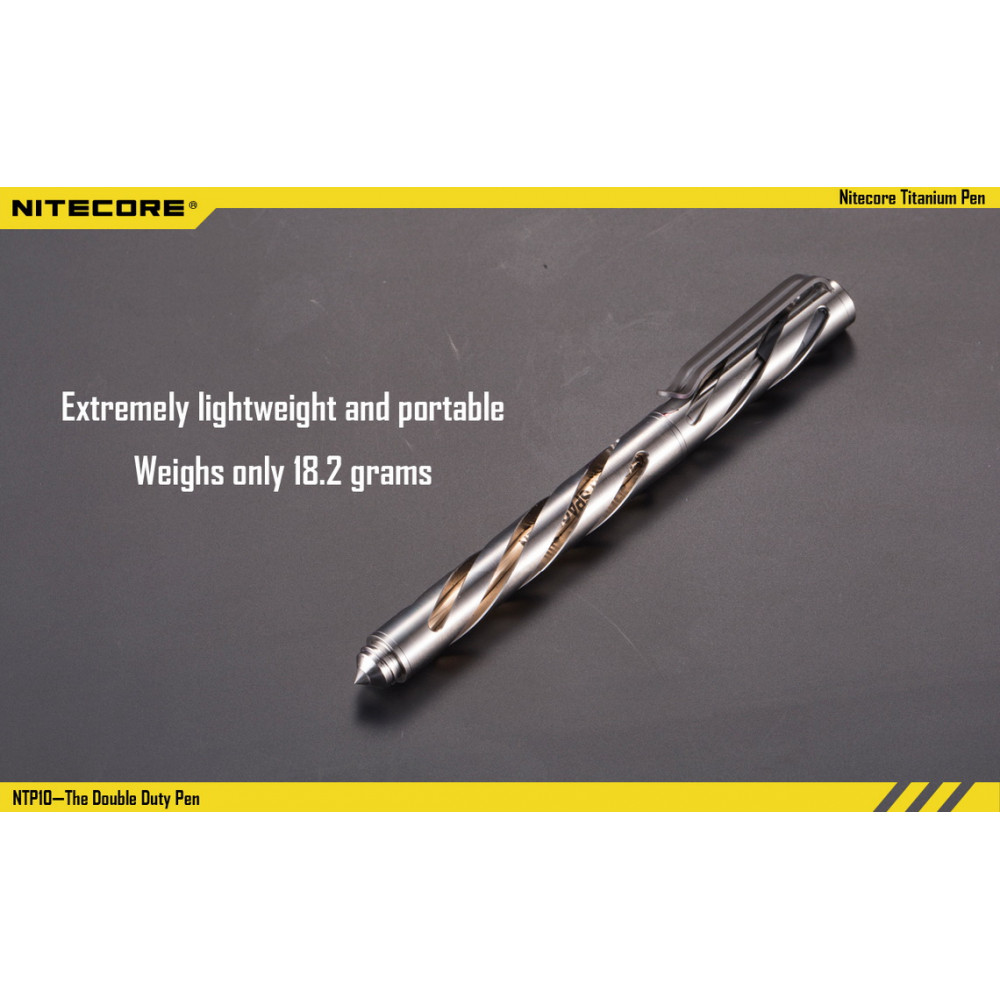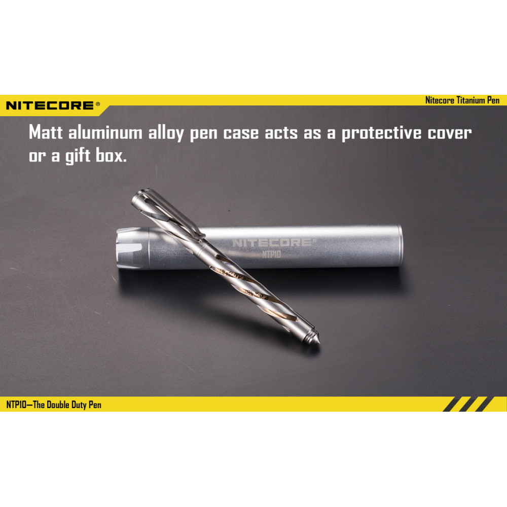 Caneta Tática Nitecore em Titânio NTP10. Com ponta em tungstênio, carga Fisher, clipe em titânio e case em alumínio. Extrema durabilidade devido ao seu corpo em titânio com 1,8mm de espessura, fazendo com que seja quase inquebrável enquanto mantém a elegância.
