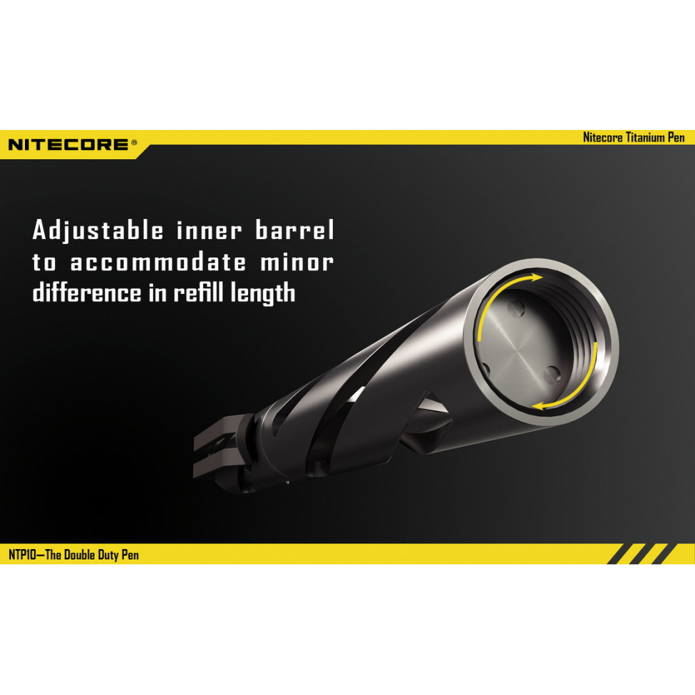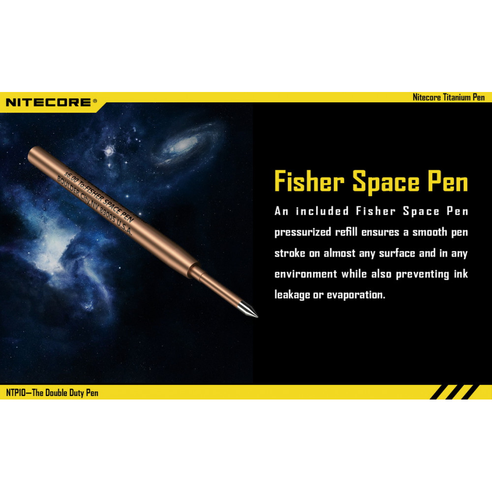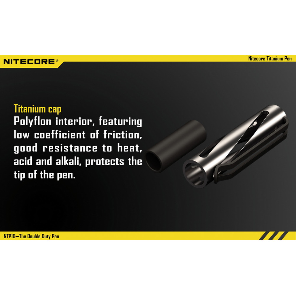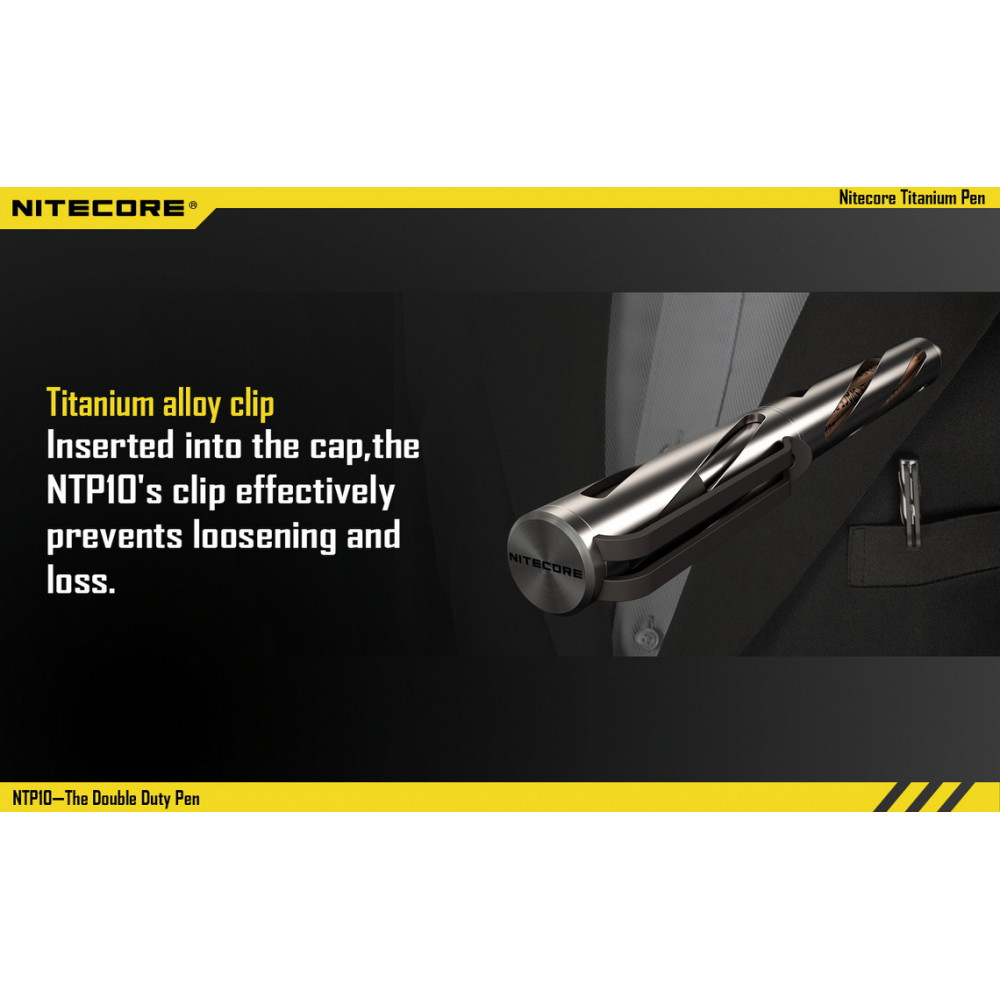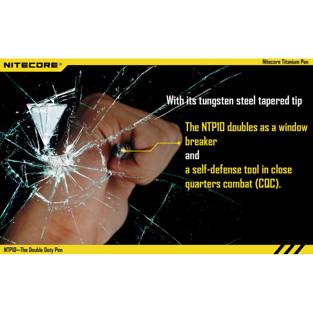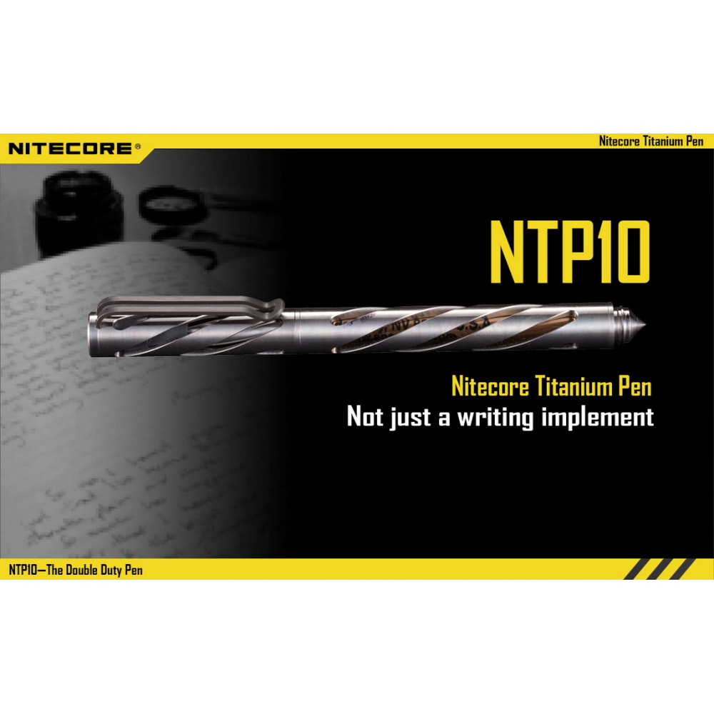 Caneta Tática Nitecore em Titânio NTP10. Com ponta em tungstênio, carga Fisher, clipe em titânio e case em alumínio. Extrema durabilidade devido ao seu corpo em titânio com 1,8mm de espessura, fazendo com que seja quase inquebrável enquanto mantém a elegância.