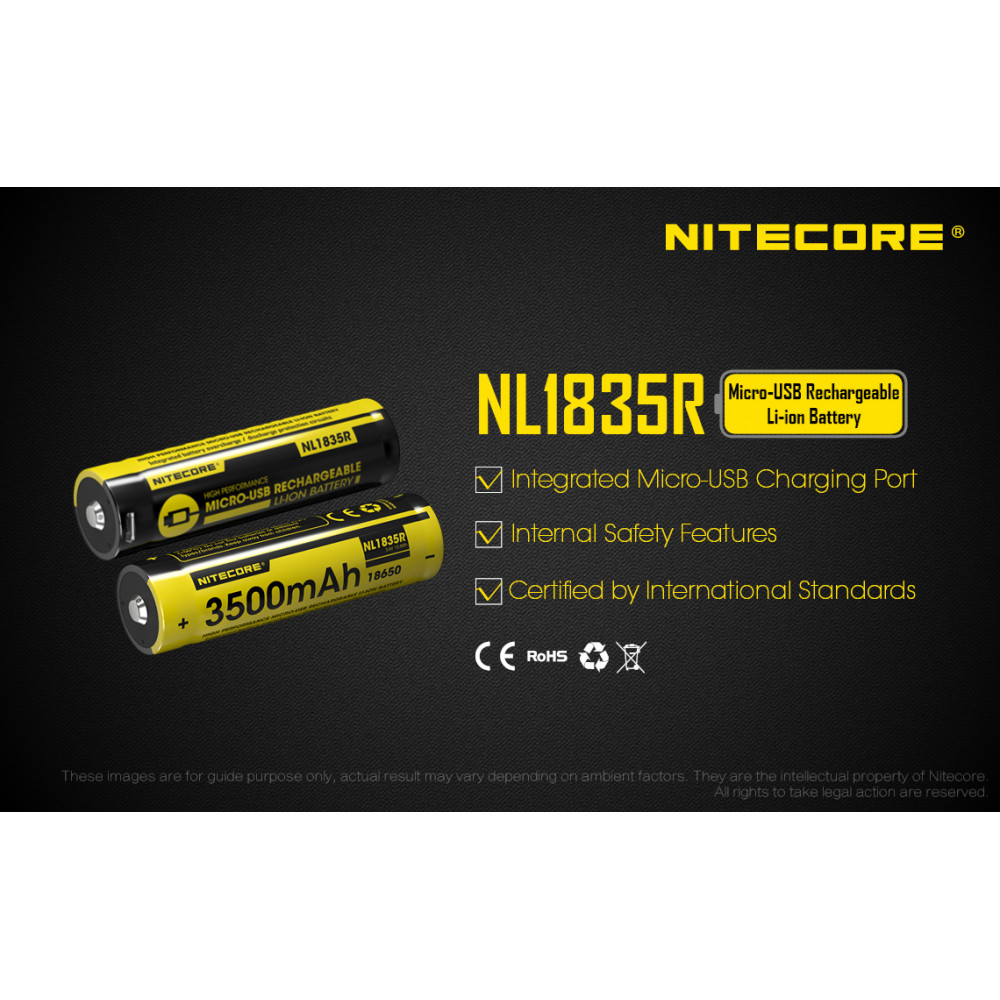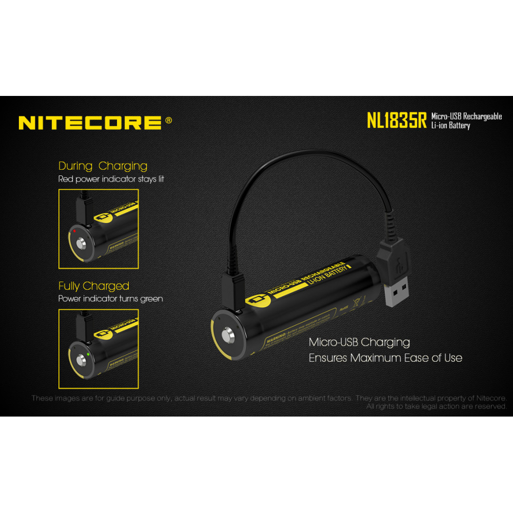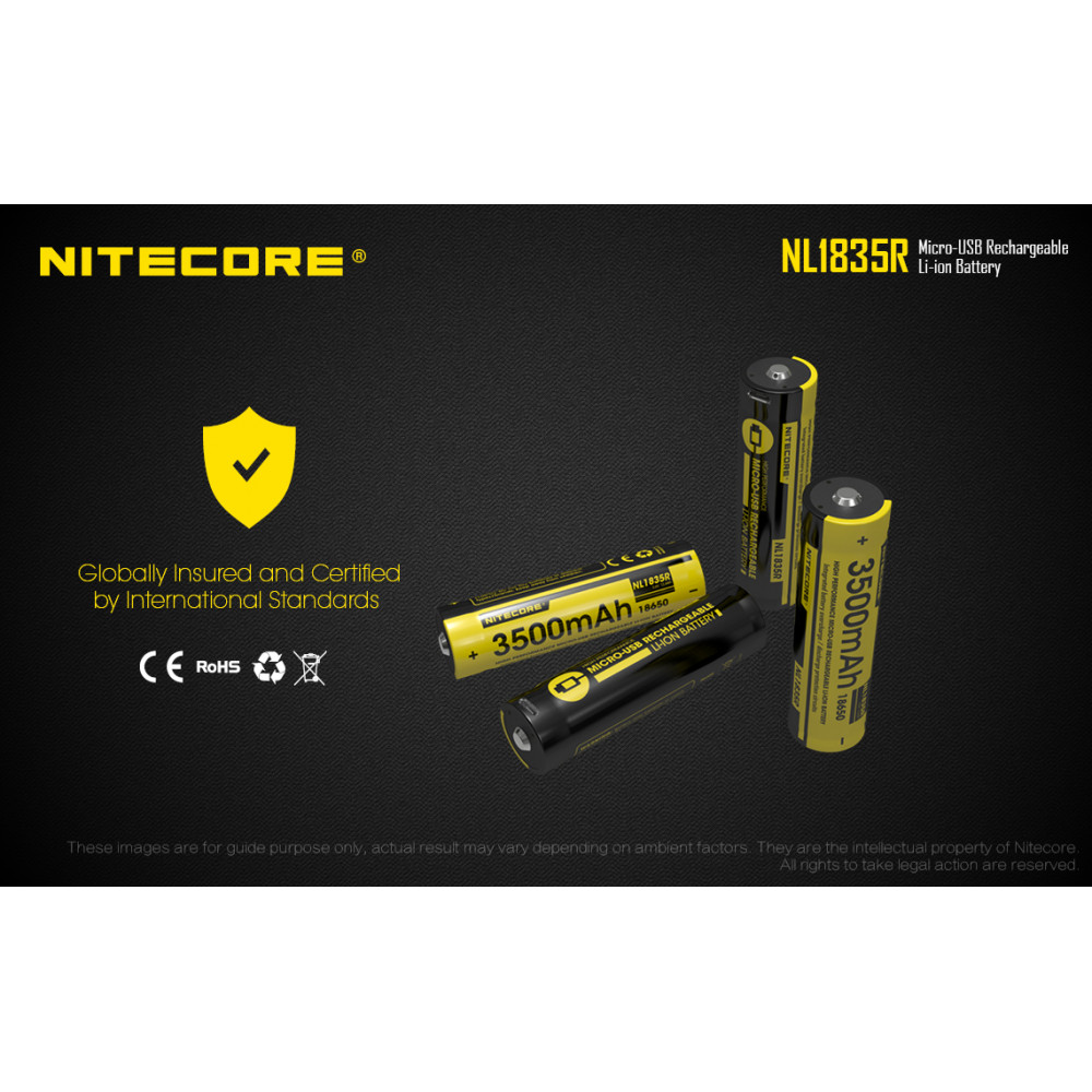 Bateria 18650 recarregável de lítio Nitecore NL1835R com micro USB integrado. Possui chip de proteção contra curto e alta temperatura, além de micro-USB no corpo para recarga. Capacidade: 3500mAh. Voltagem: 3,6V. .