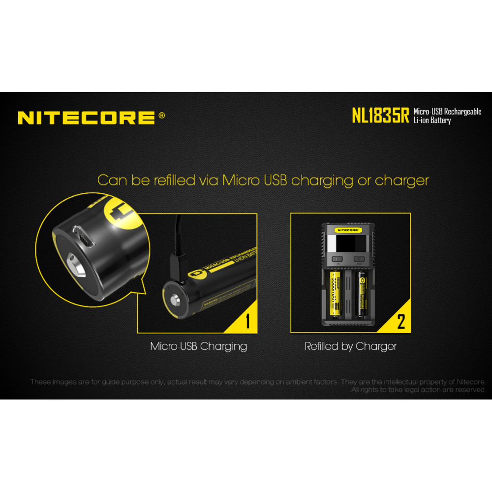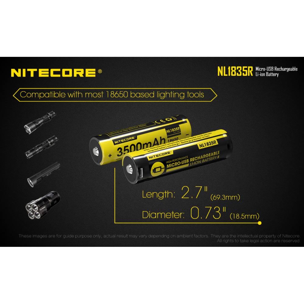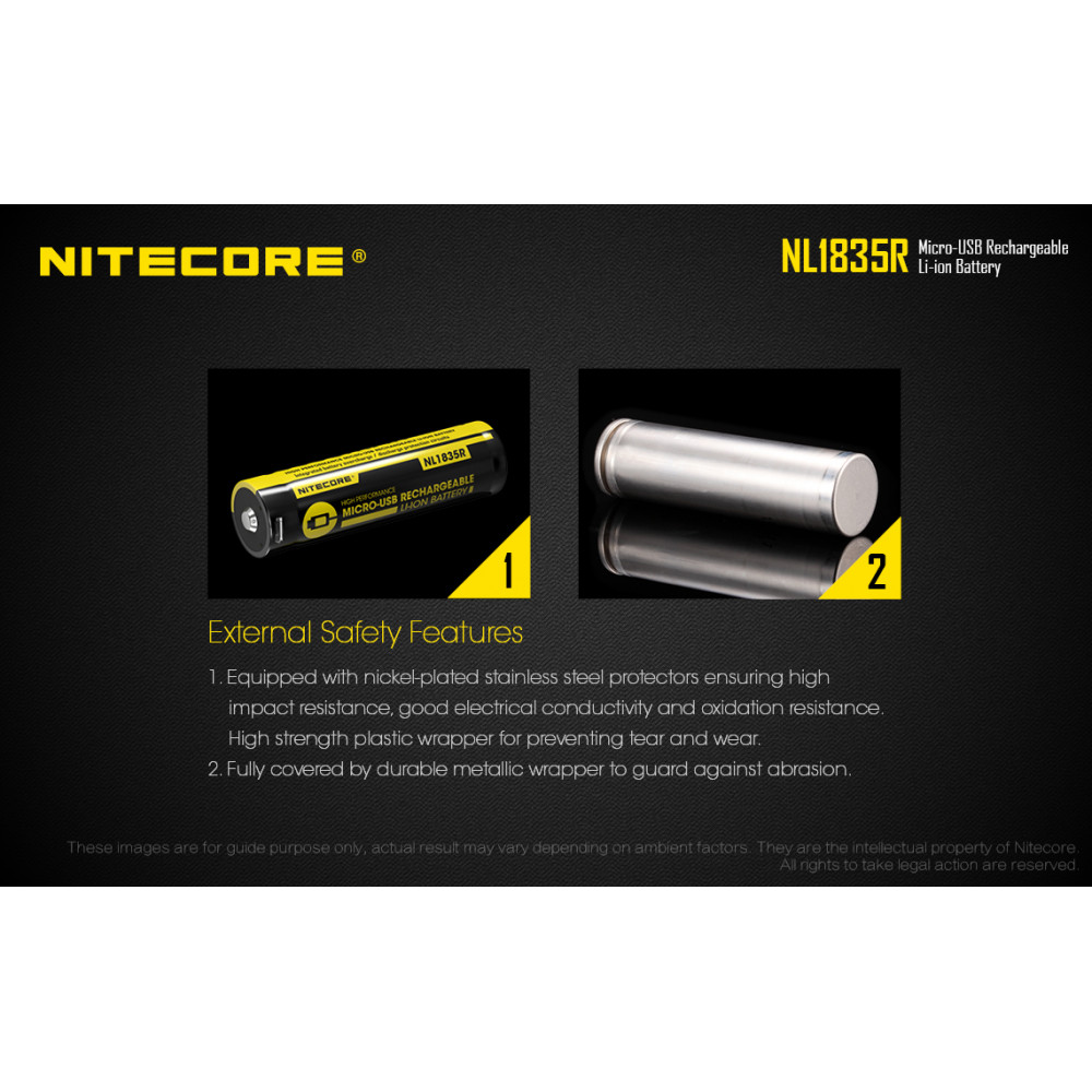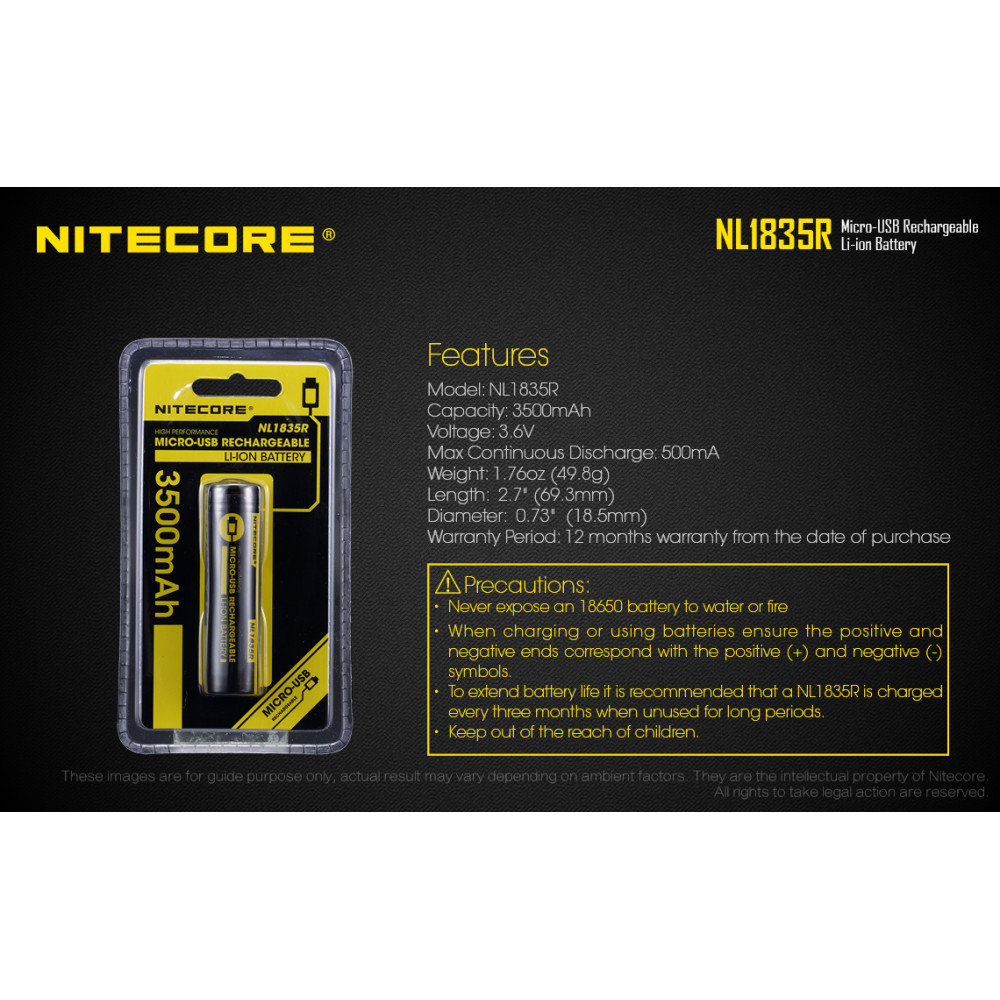 Bateria 18650 recarregável de lítio Nitecore NL1835R com micro USB integrado. Possui chip de proteção contra curto e alta temperatura, além de micro-USB no corpo para recarga. Capacidade: 3500mAh. Voltagem: 3,6V. .