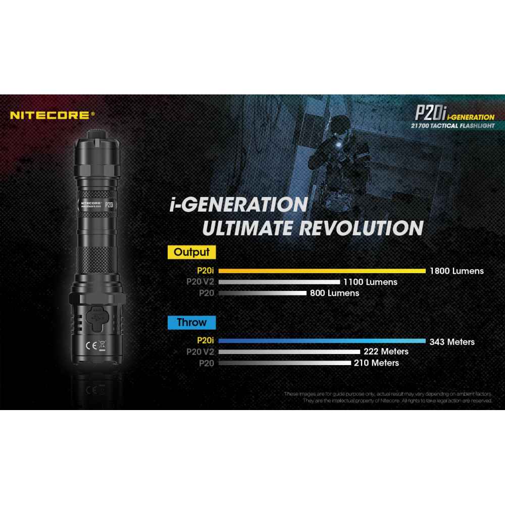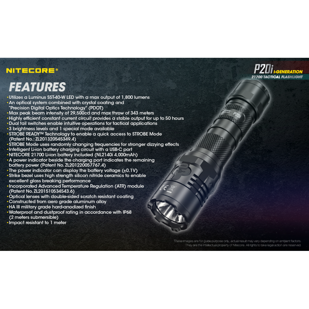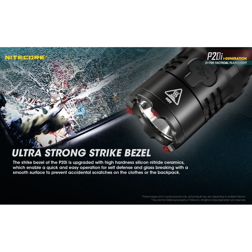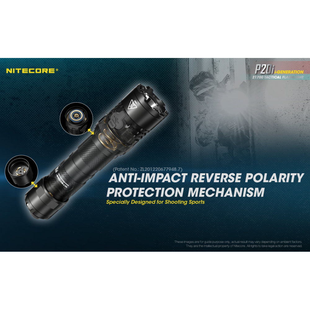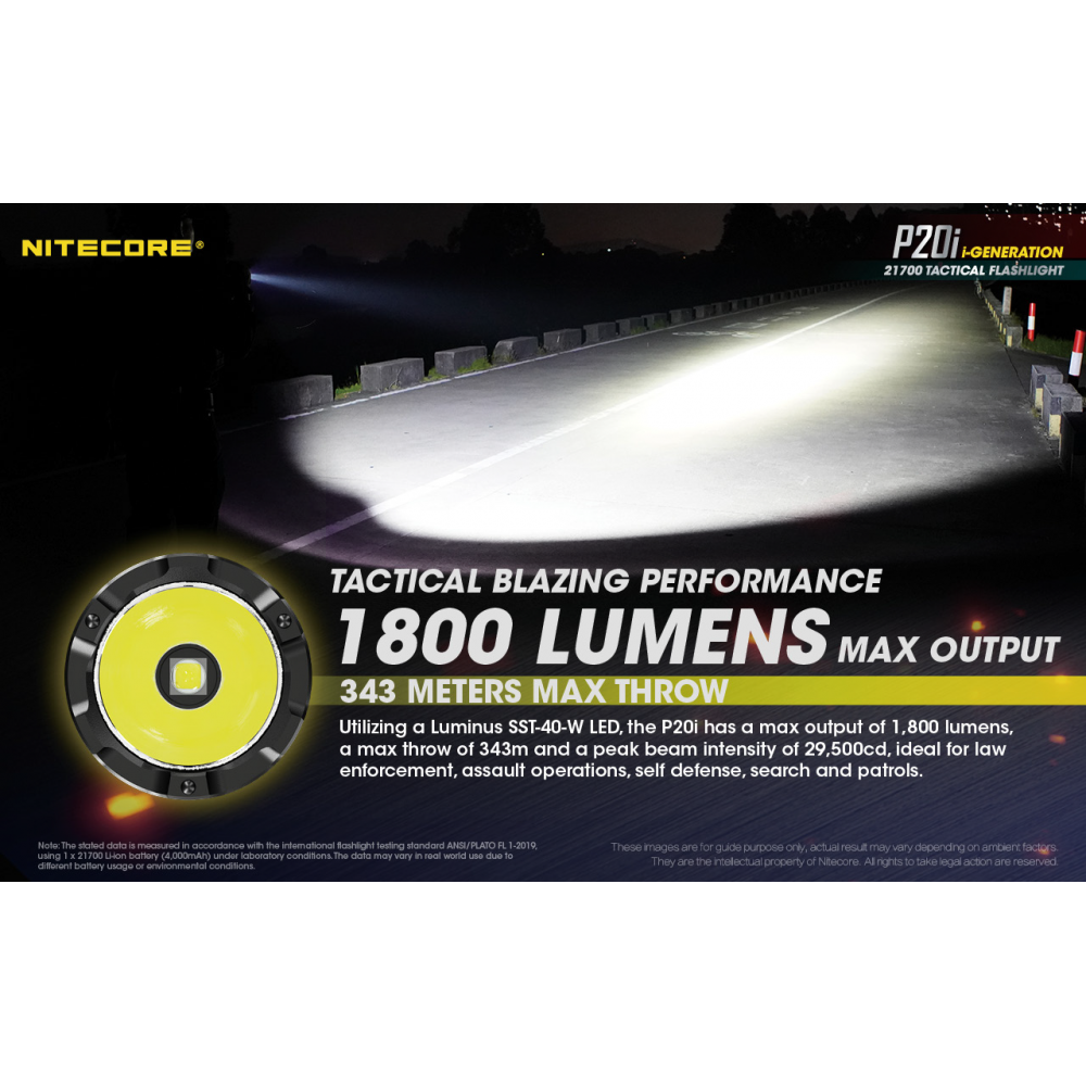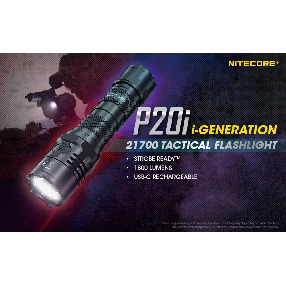 A Lanterna Nitecore P20i é de alto desempenho, emitindo até 1800 lumens com alcance máximo de343 metros. Vem equipada com modo estroboscópio não linear e modo de ataque ultraforte. Os padrões estroboscópicos não lineares causam efeitos estonteantes aumentados, altamente eficazes para difundir uma situação tensa.