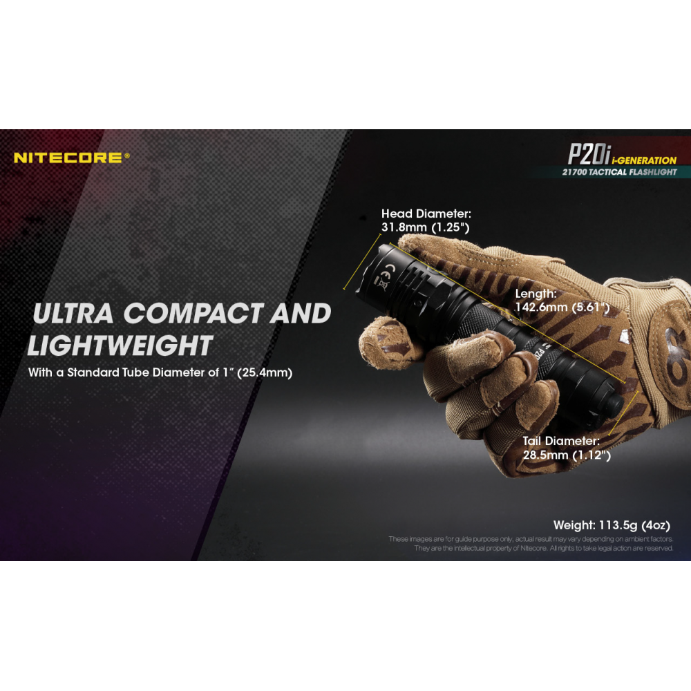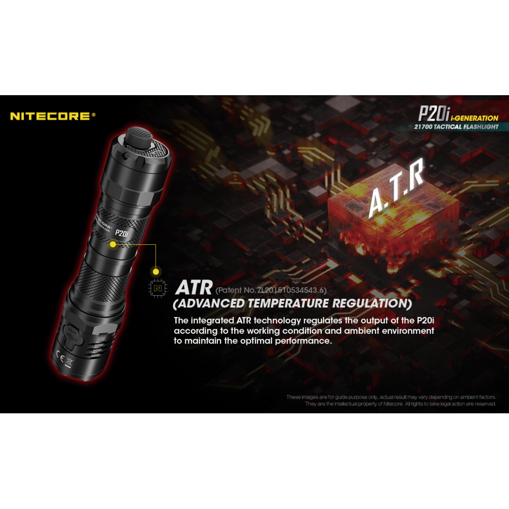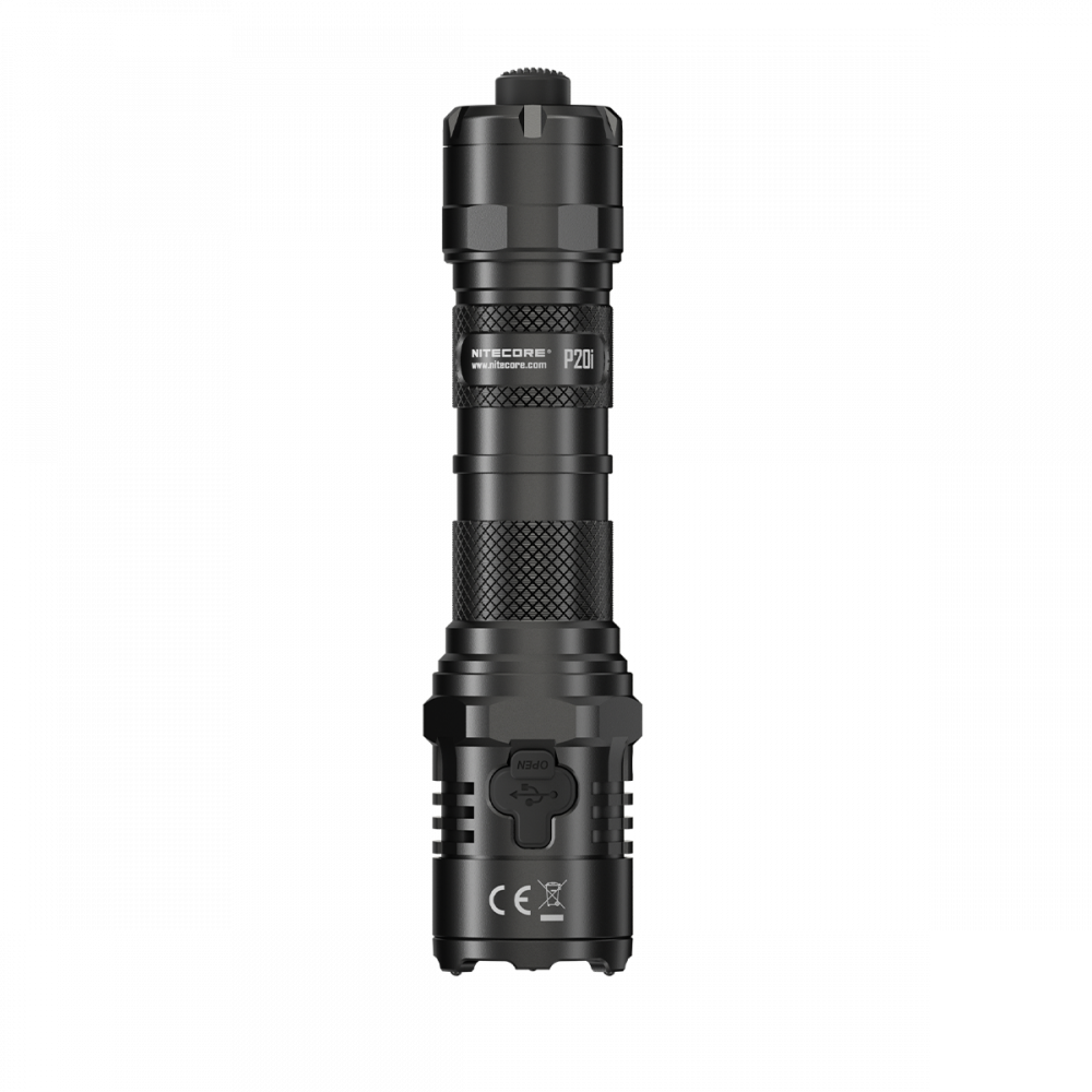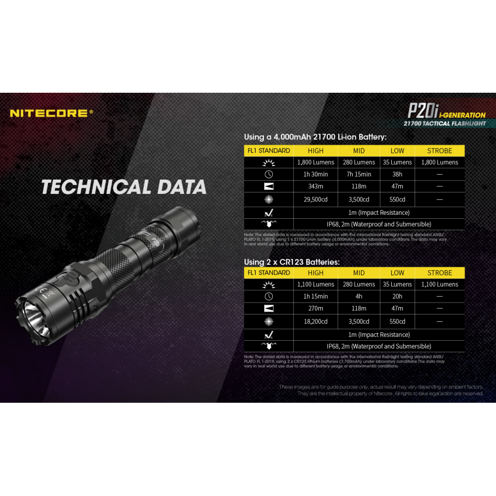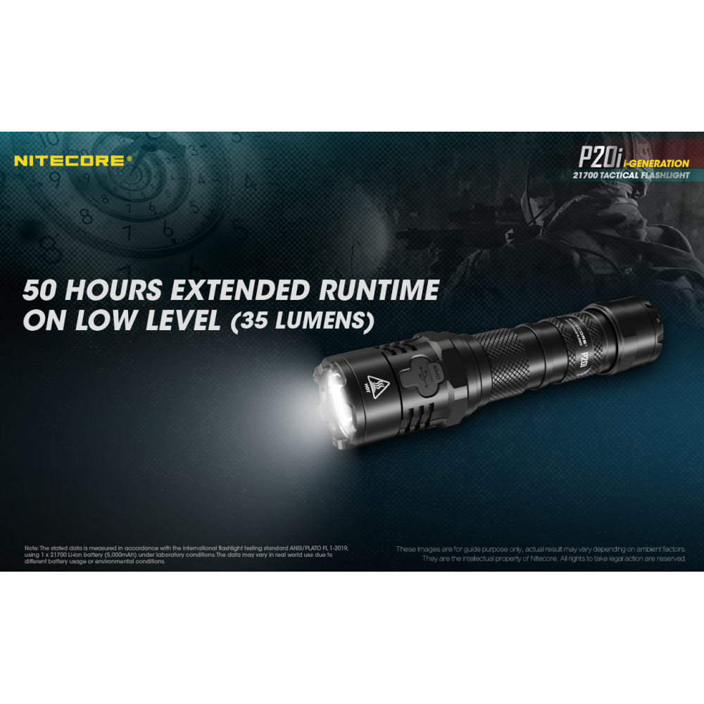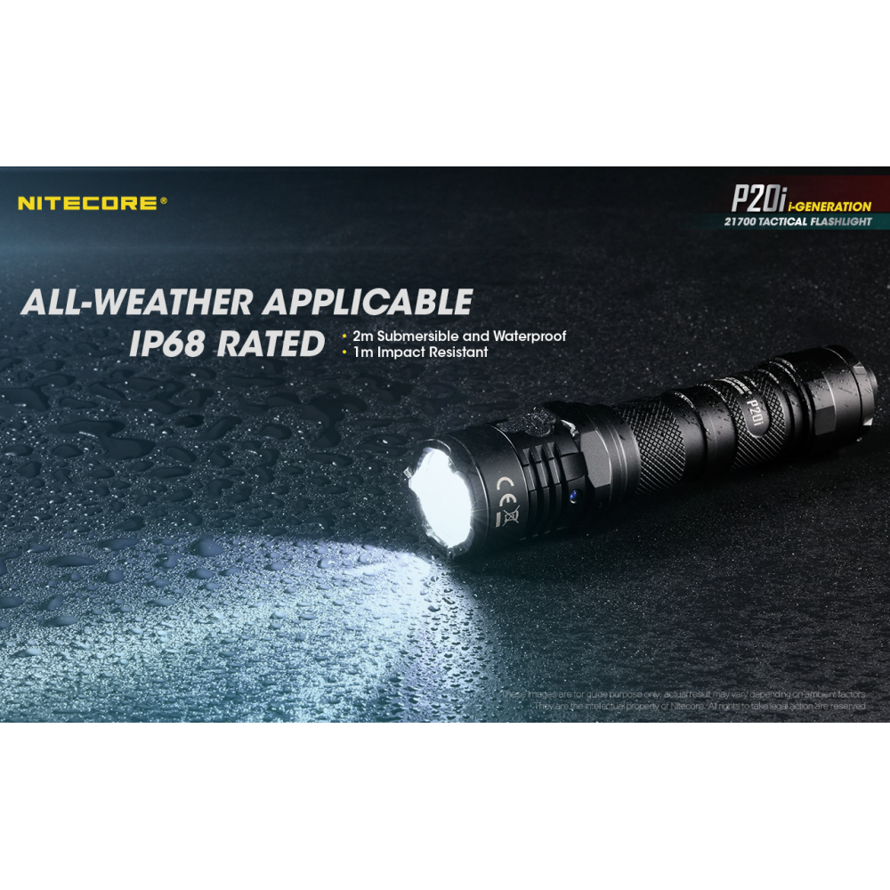 A Lanterna Nitecore P20i é de alto desempenho, emitindo até 1800 lumens com alcance máximo de343 metros. Vem equipada com modo estroboscópio não linear e modo de ataque ultraforte. Os padrões estroboscópicos não lineares causam efeitos estonteantes aumentados, altamente eficazes para difundir uma situação tensa.