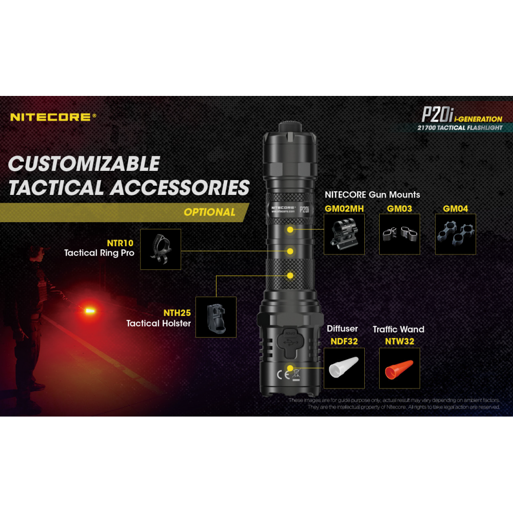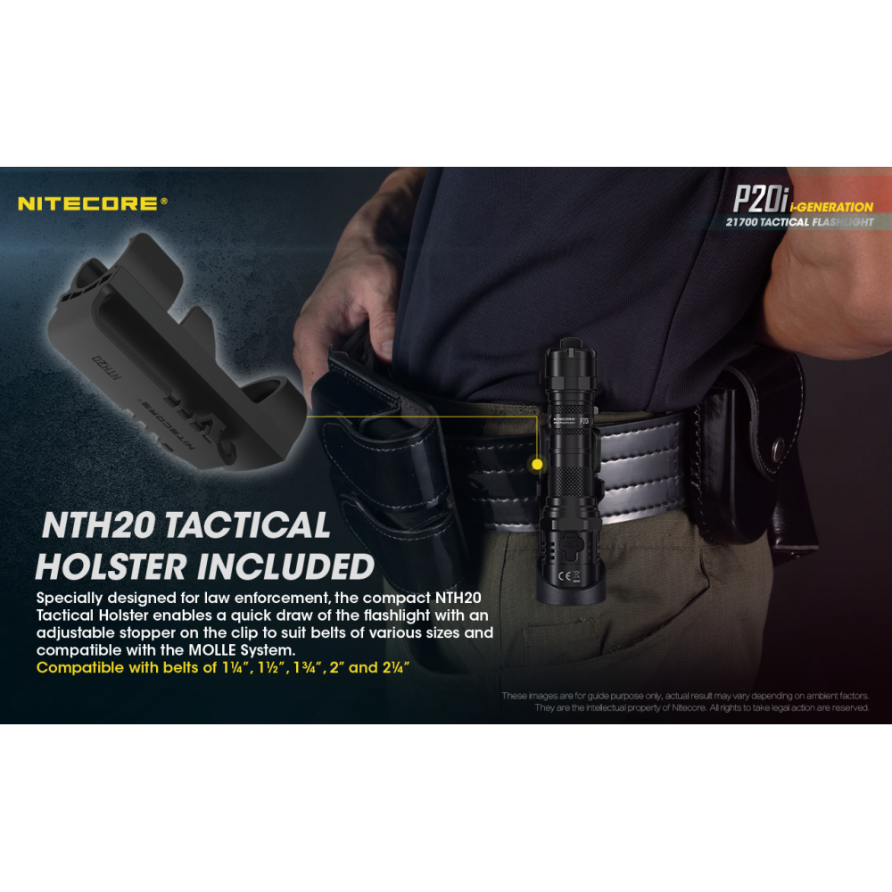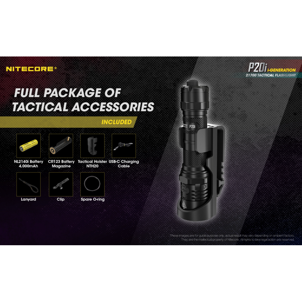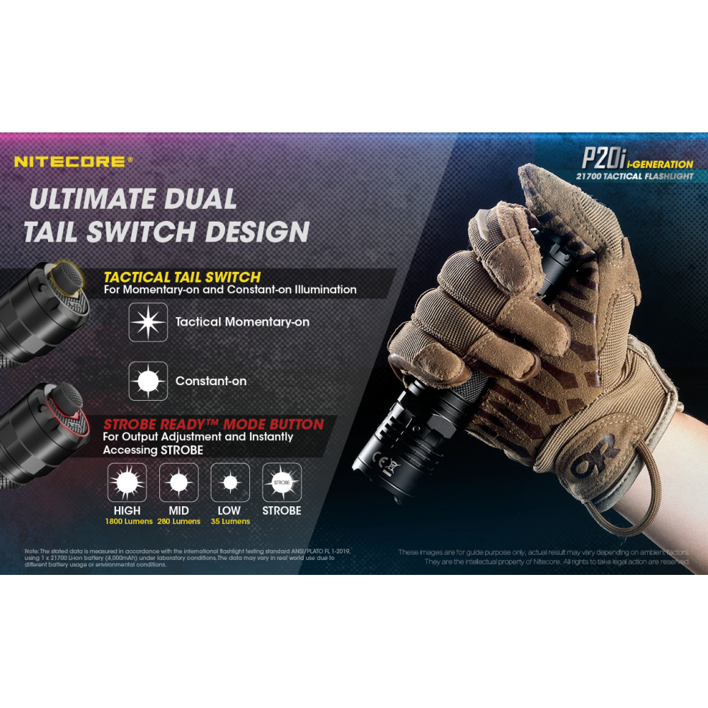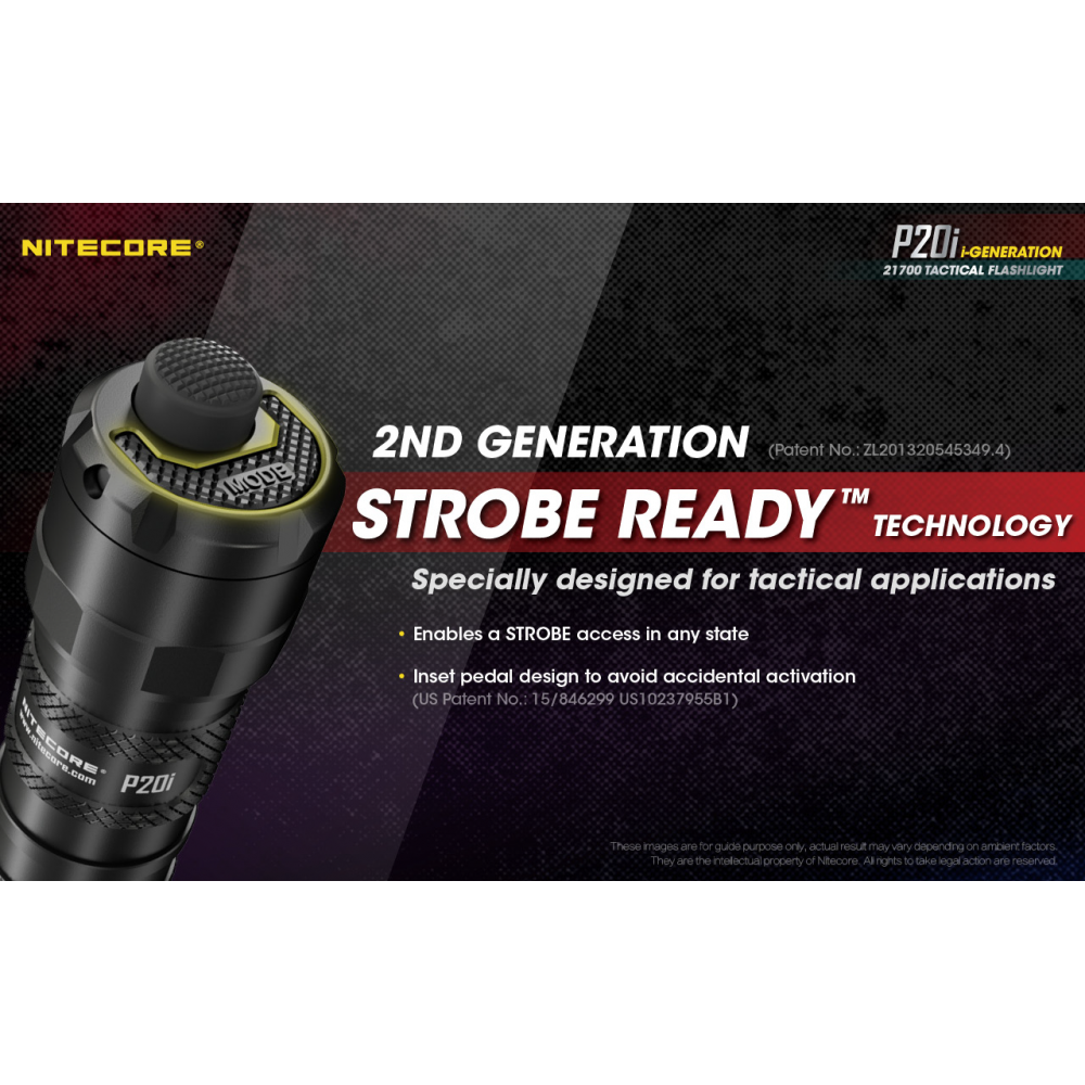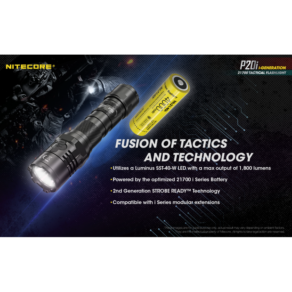 A Lanterna Nitecore P20i é de alto desempenho, emitindo até 1800 lumens com alcance máximo de343 metros. Vem equipada com modo estroboscópio não linear e modo de ataque ultraforte. Os padrões estroboscópicos não lineares causam efeitos estonteantes aumentados, altamente eficazes para difundir uma situação tensa.