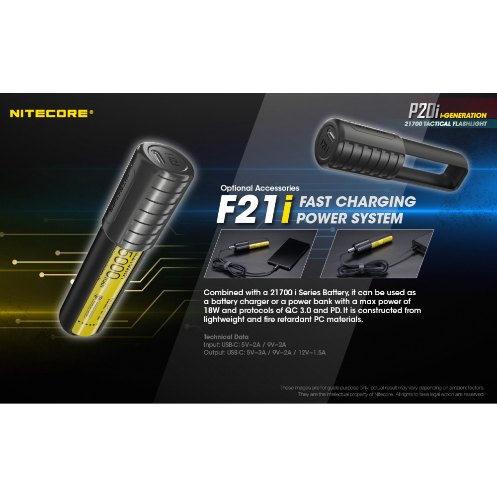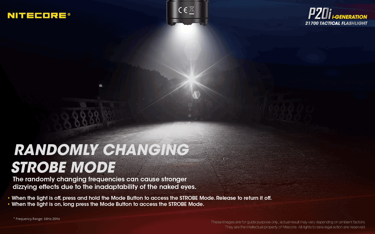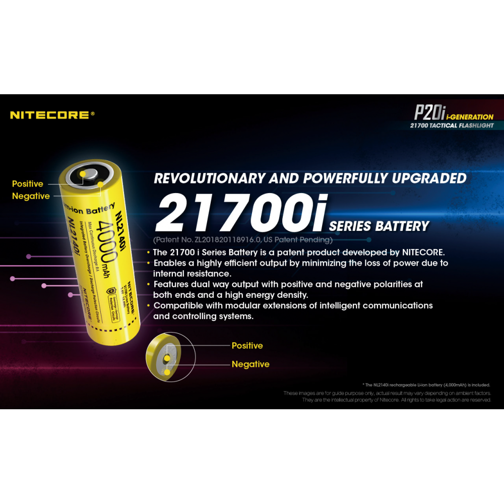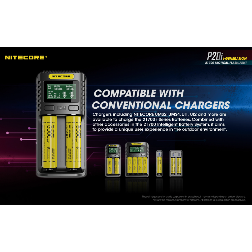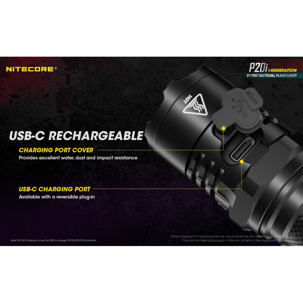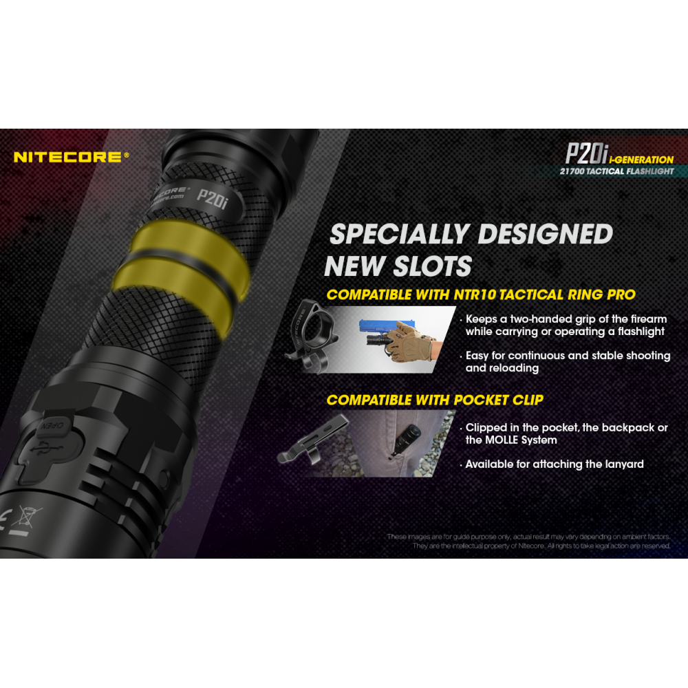 A Lanterna Nitecore P20i é de alto desempenho, emitindo até 1800 lumens com alcance máximo de343 metros. Vem equipada com modo estroboscópio não linear e modo de ataque ultraforte. Os padrões estroboscópicos não lineares causam efeitos estonteantes aumentados, altamente eficazes para difundir uma situação tensa.