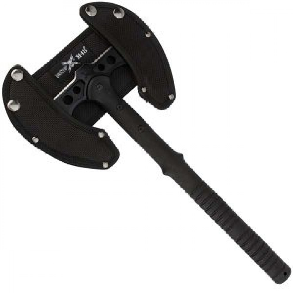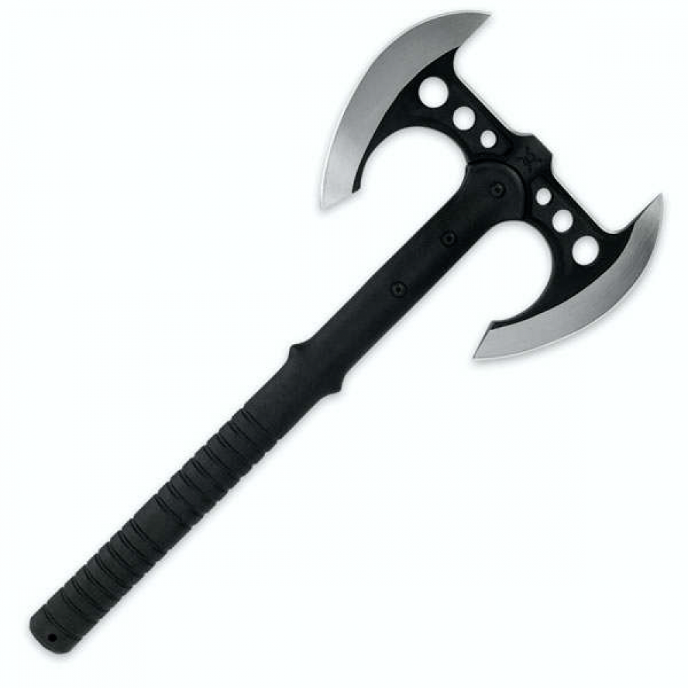 Machado lâmina dupla e cabo em polímero. Tamanho total: 42,9 cm. Tamanho da lâmina: 14 cm. Material da lâmina: Aço inox 2Cr13.